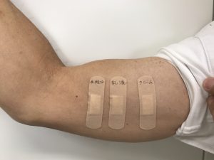皮膚の柔らかい腕内側にバンドエイドに調べたい化粧品を塗布して貼ってください。その間の入浴は濡れないようにして入り、2日間で2回、同じ個所に同じ量を塗ったバンドエイドを貼り直して肌の状態を確認し、どの化粧品で赤くなるかを調べます。また新しい化粧品を使用する前も、同様に確認を行うとカブレの予防にもなります。